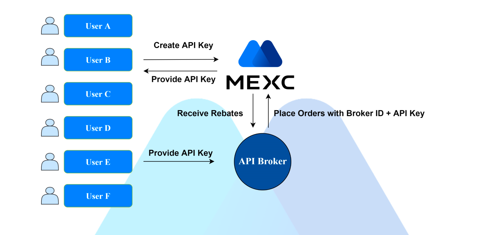 The user signs up at MEXC, applies for API Key in MEXC, and provides it to the broker.