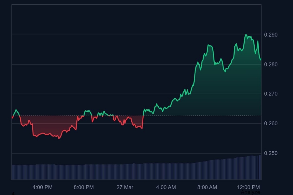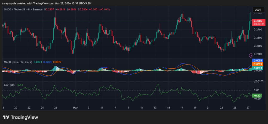Meanwhile, ONDO has jumped by over 8.72% in the last 24 hours, and it has tested the crucial resistance levels. At press time, the asset is trading at around the $0.2812 range, with its daily trading volume having surged by over 66.54%, reaching the $149.39 million mark.