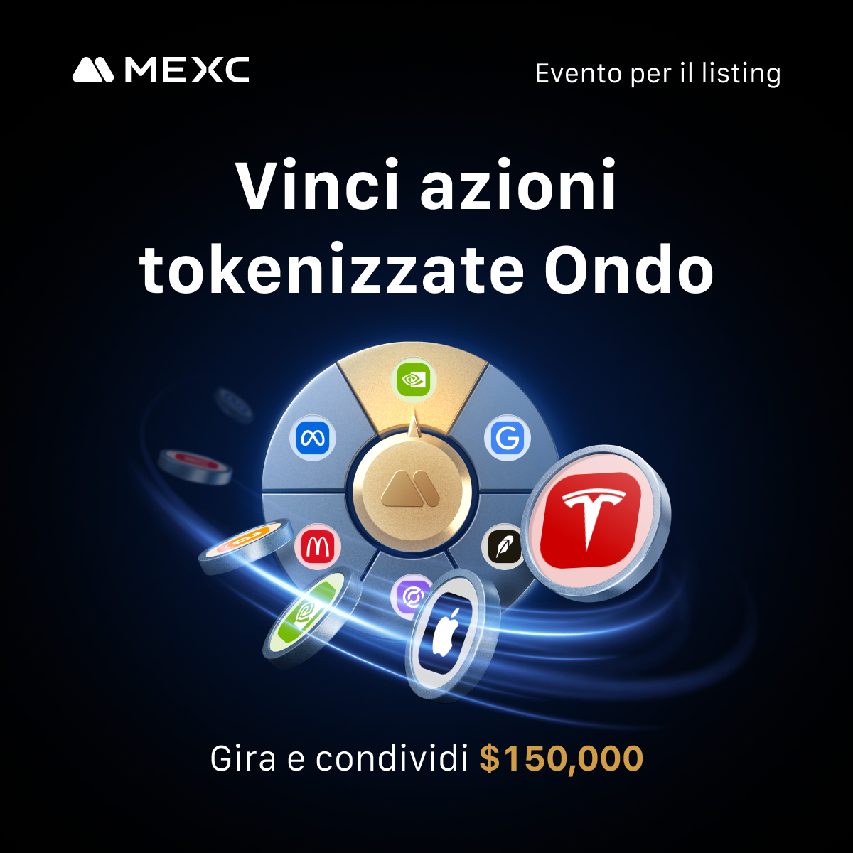 MEXC è leader nel listing di azioni tokenizzate di ONDO Global Markets, con asset di punta come NVDA, TSLA, AMZN, AAPL, META, GOOGL, COIN, HOOD, CRCL e MCD. Sii tra i primi a festeggiare e a vincere una quota del montepremi!