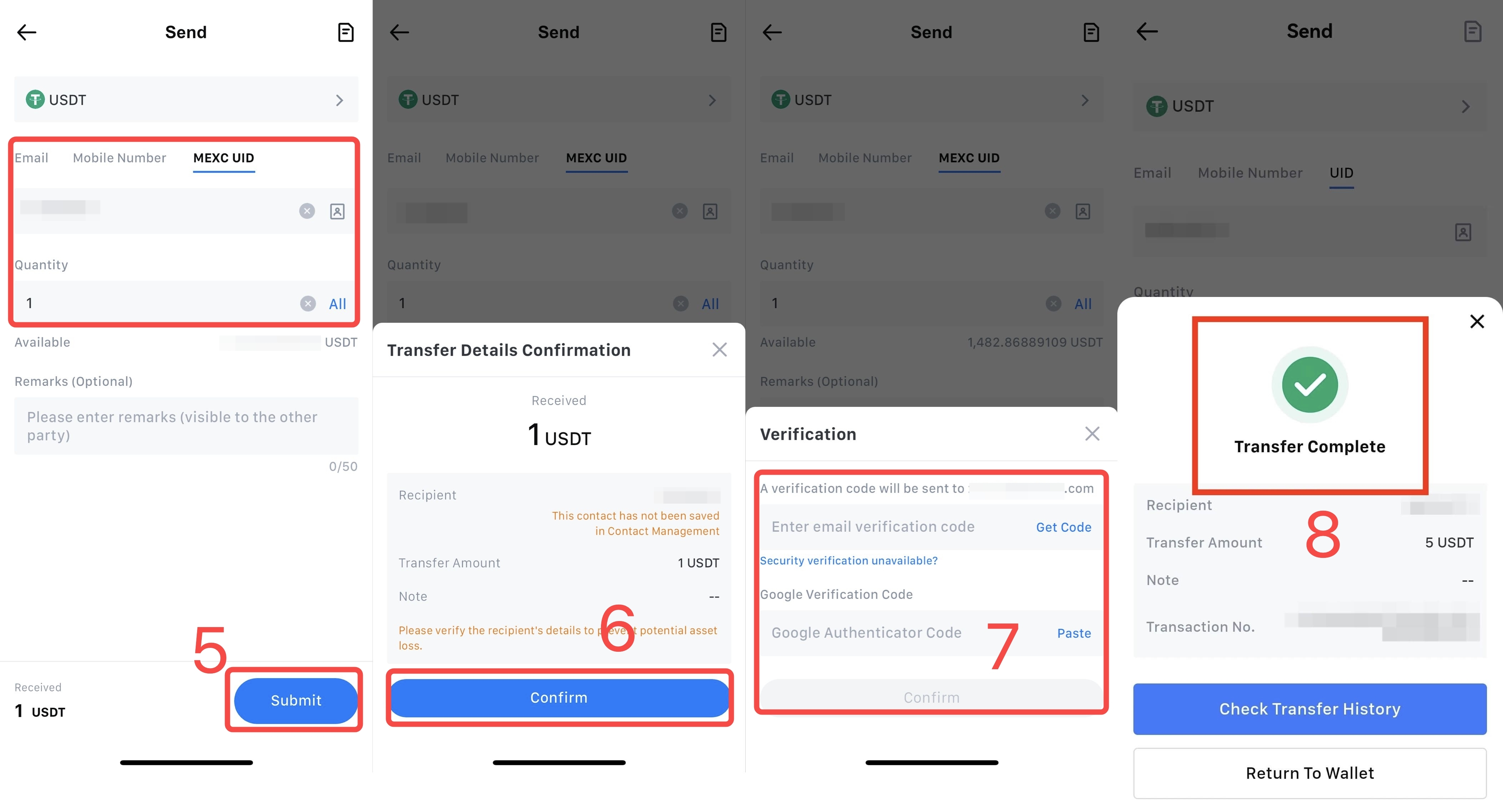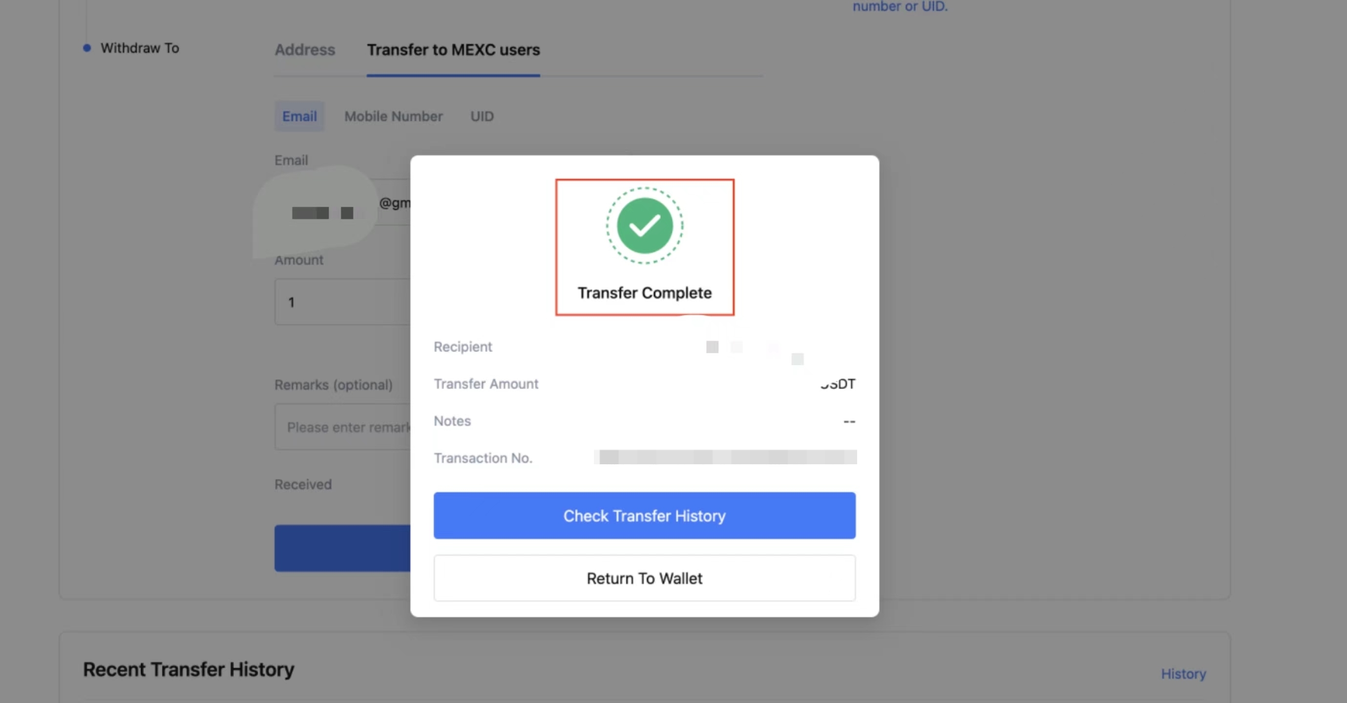 5) Inserisci le informazioni dell'account del destinatario e l'importo, quindi fai clic su Invia. Attualmente sono supportati tre metodi di trasferimento: e-mail, Cellulare e UID.