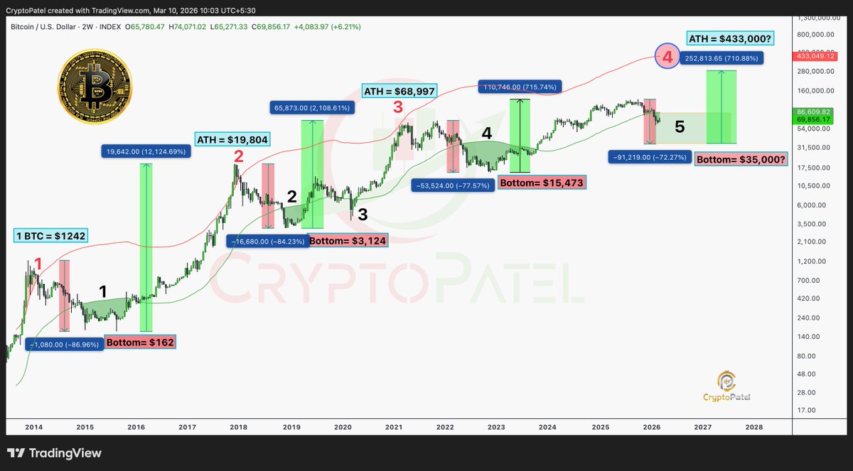 The analysis pairs the 2-year moving average with a separate red line representing historical cycle tops. That upper band currently sits near $430,000. The framework treats Bitcoin’s price as oscillating between the green accumulation zone below the 2-year moving average and the red distribution zone at the cycle top indicator. From $70,000 to $430,000 represents a 6.1x return.