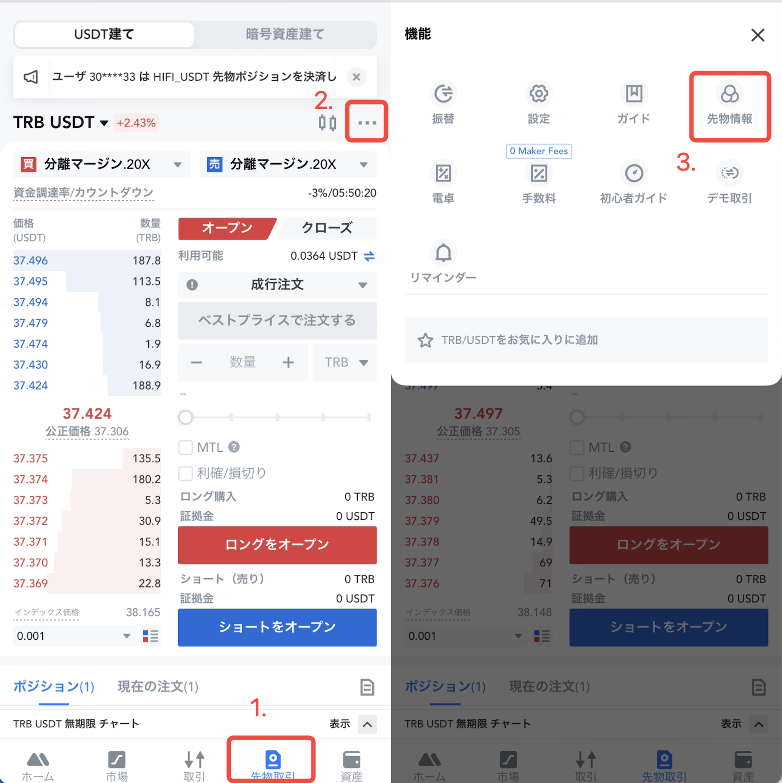 - ユーザー様は、注文を行う前に、随時資金調達率を参照いただくことをお勧め致します。既存の注文については、強制決済を防ぐため適宜ポジションと証拠金の調整をお願い致します。