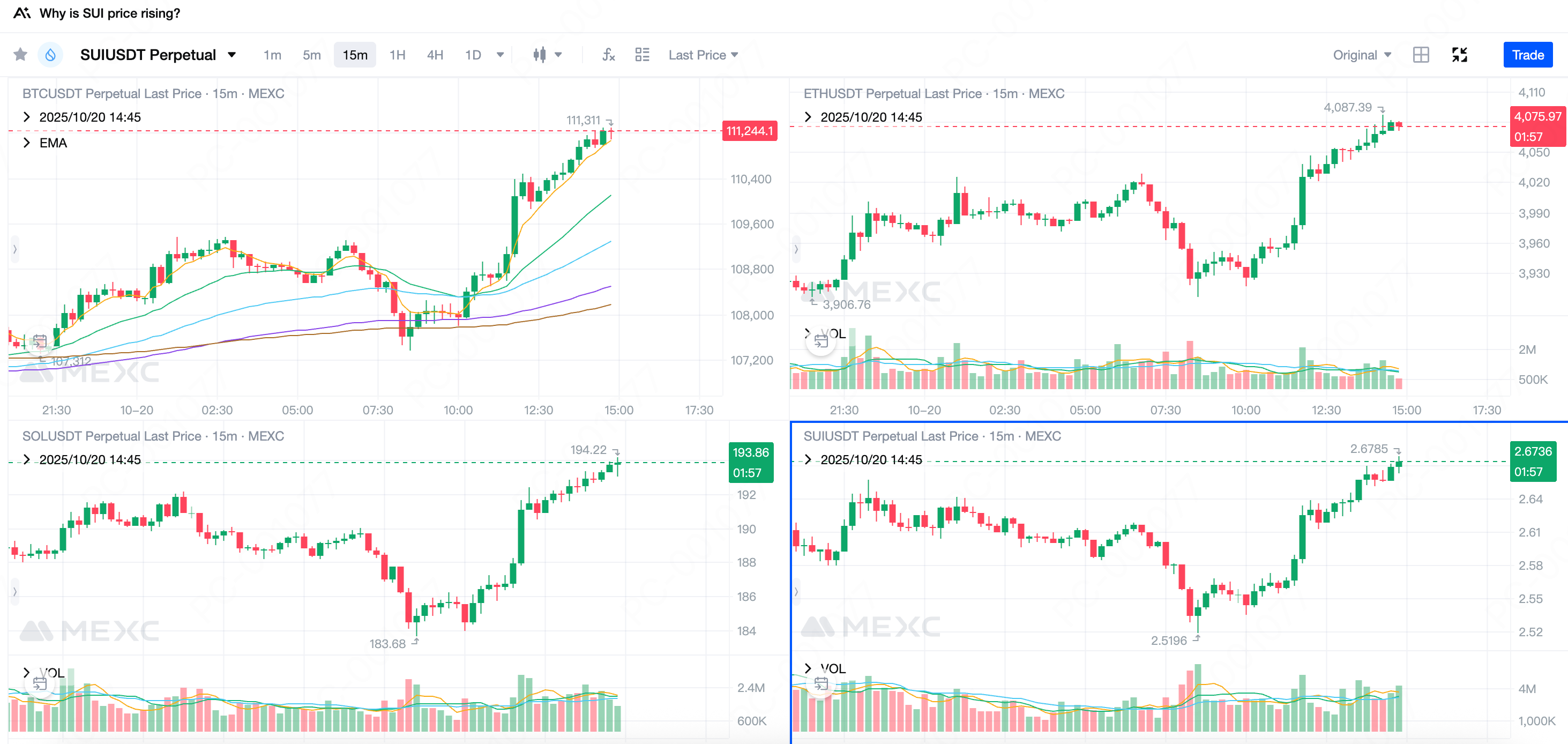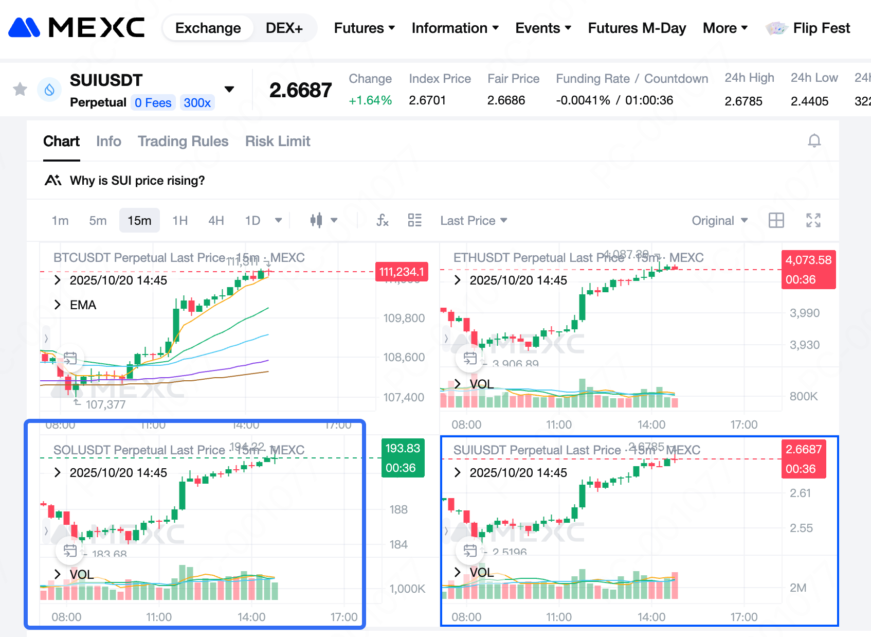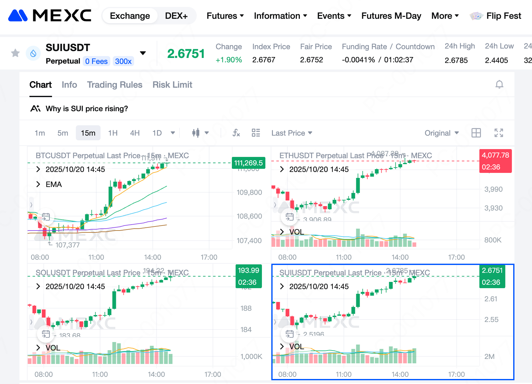 If you want to add a futures pair to your watchlist, you can select it in the shortcut display area below the navigation bar. As shown in the animation, we have adjusted the fourth window to SUIUSDT perpetual futures .