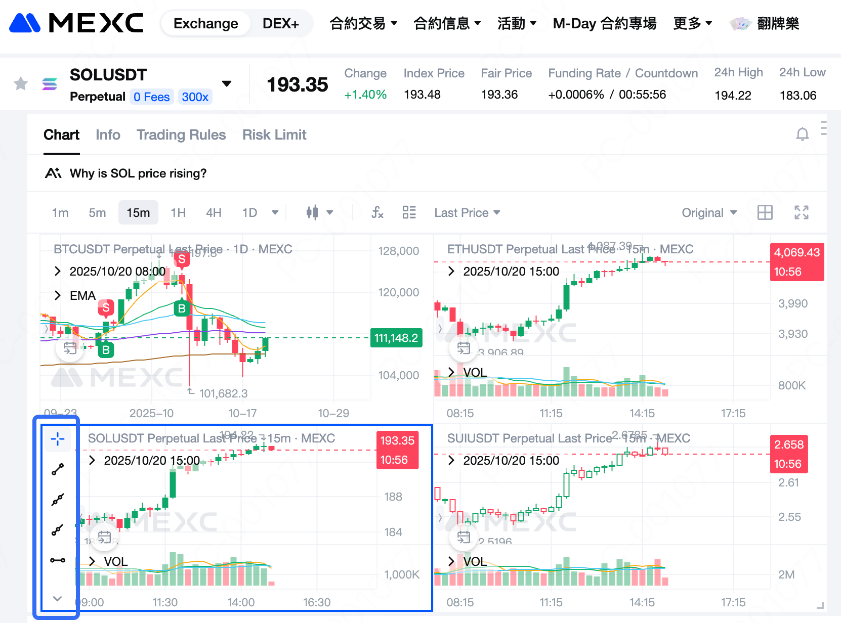 For users who are accustomed to trading multiple different futures, they can use the same-screen multi-window function provided by MEXC futures products to display the K-line trends of multiple trading pairs on one screen, avoiding multiple switching and greatly improving the efficiency of monitoring the market.