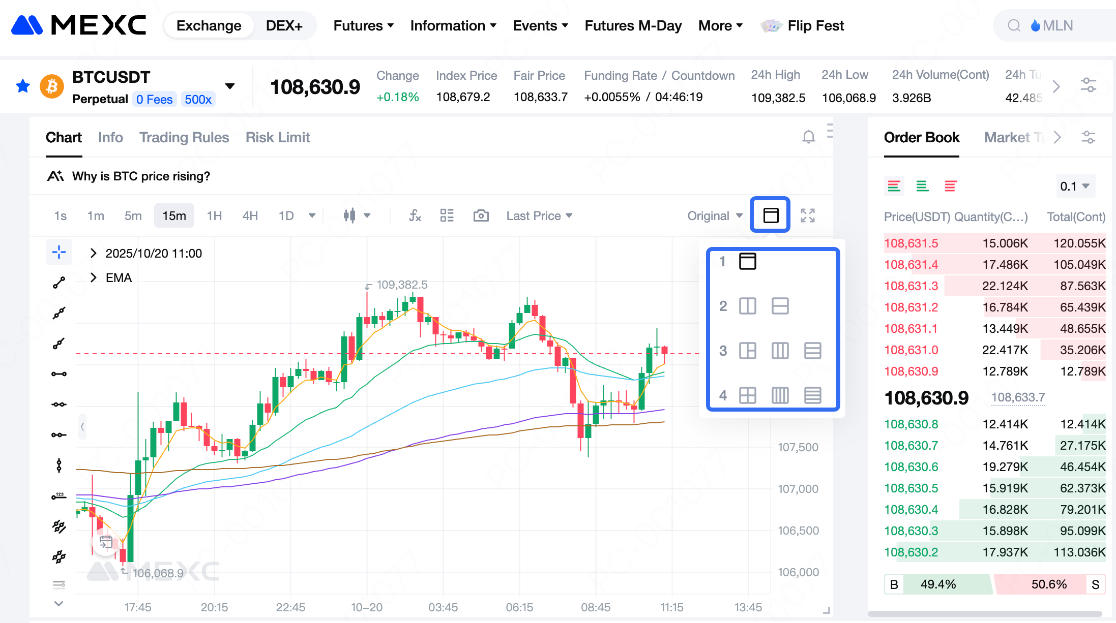 MEXC futures currently supports up to 4 windows to be displayed on the same screen. Multiple arrangements are provided for different window numbers, and you can choose according to your preferences.