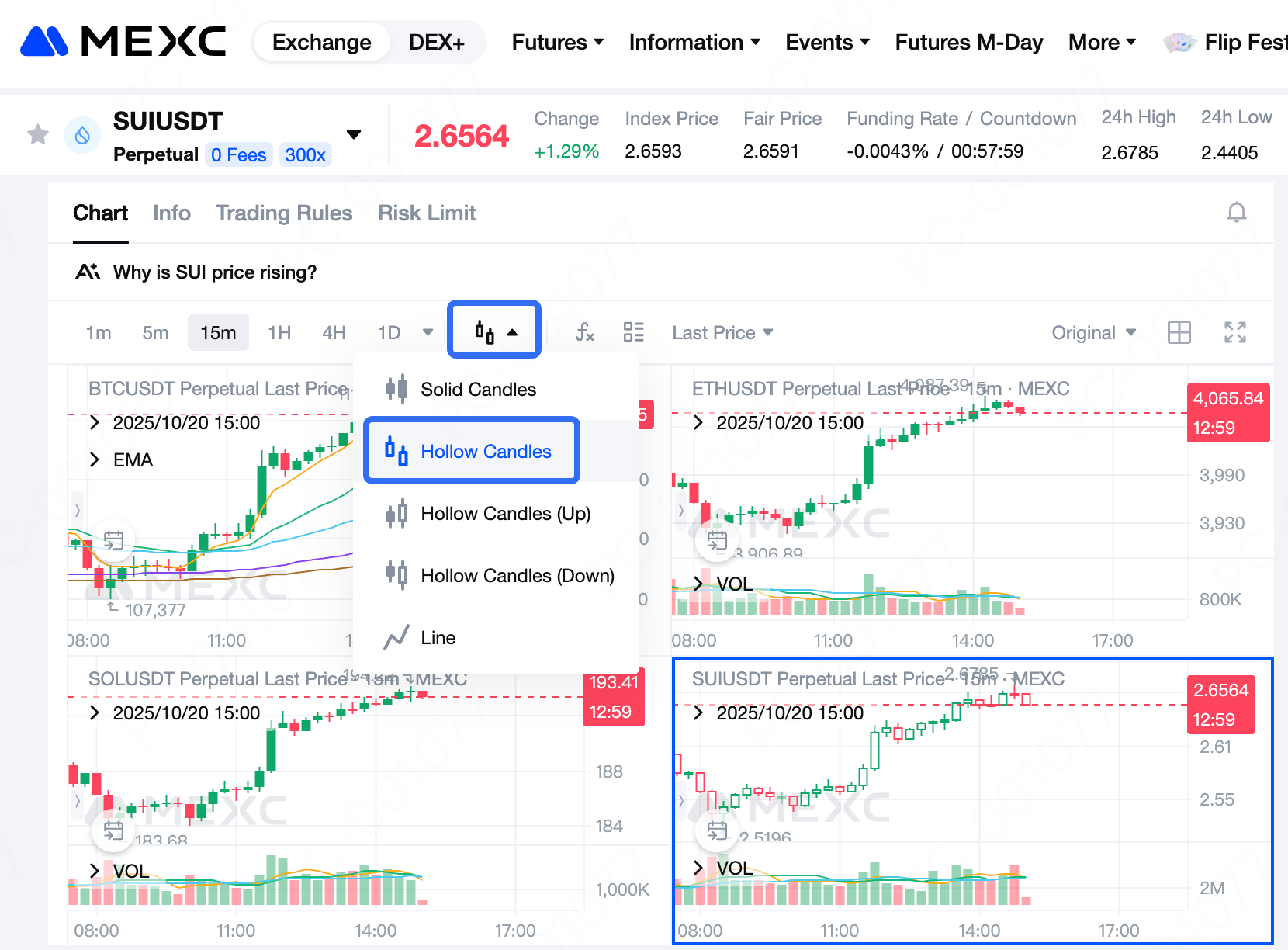 As shown in the figure, we selected the fourth SUIUSDT futures window and adjusted the solid candlestick appearance of this window to a hollow candlestick.