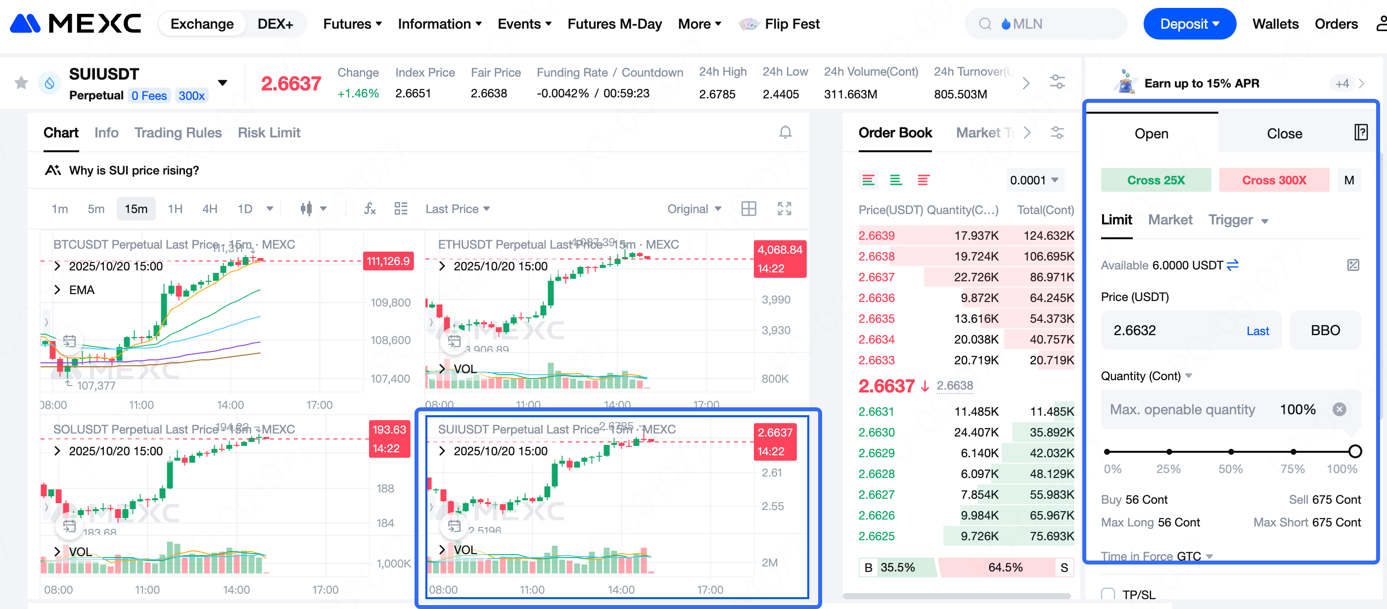 As shown in the figure, we have currently selected the fourth window for SUIUSDT perpetual futures trading. The right order area is synchronously adjusted to SUI trading. You can create a long or short position after selecting the margin mode, leverage ratio, and quantity.