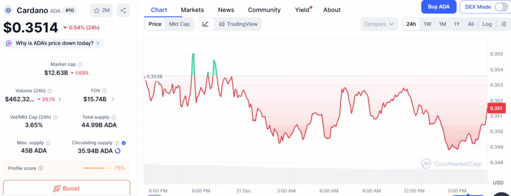 The development is yet to be reflected in the ADA price, which is down by 0.54% over the last 24 hours. The Cardano token is listed at $0.3514 with a dip of 25.1% in 24-hour trading volume. The market cap has also plunged by 1.03% while the article is being drafted.