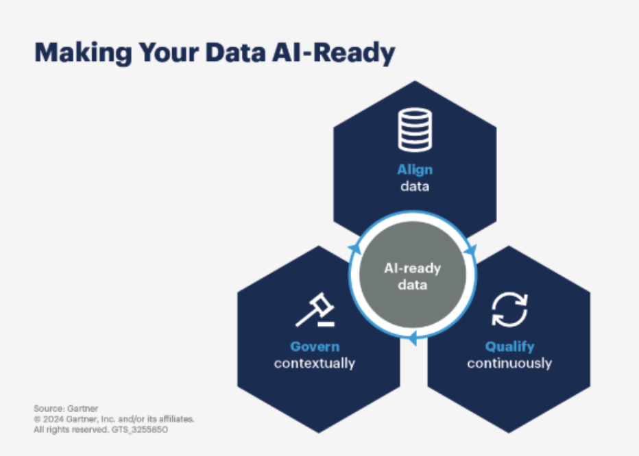 Image: Diagram showing how AI-ready data is created by aligning data, governing it contextually, and qualifying it continuously | Source: Gartner