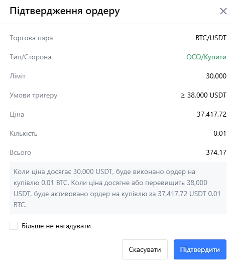 Переконавшись, що налаштування правильні, підтвердьте ордер.
