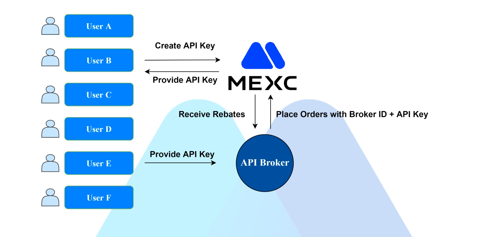 包括集跟单平台、交易机器人、量化策略平台或其他500人以上资产管理平台等,用户可以将API key授权给API经纪商,API经纪商代替用户发送含有经济商ID的交易订单,获取手续费分润。