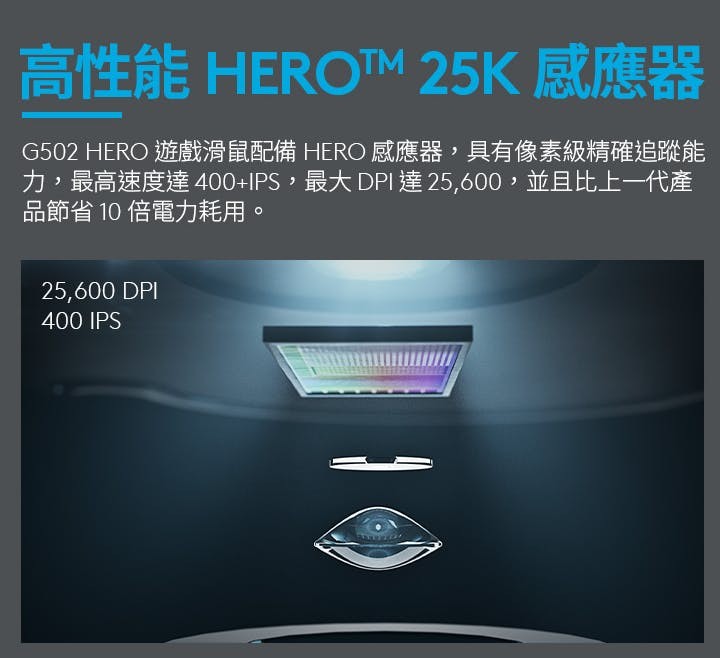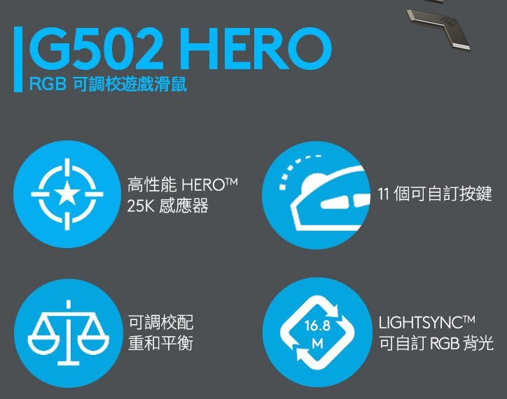 ▲G502 Hero的4大特色,其中高階感應器、多自訂鍵、配重都是高階產品的特色。